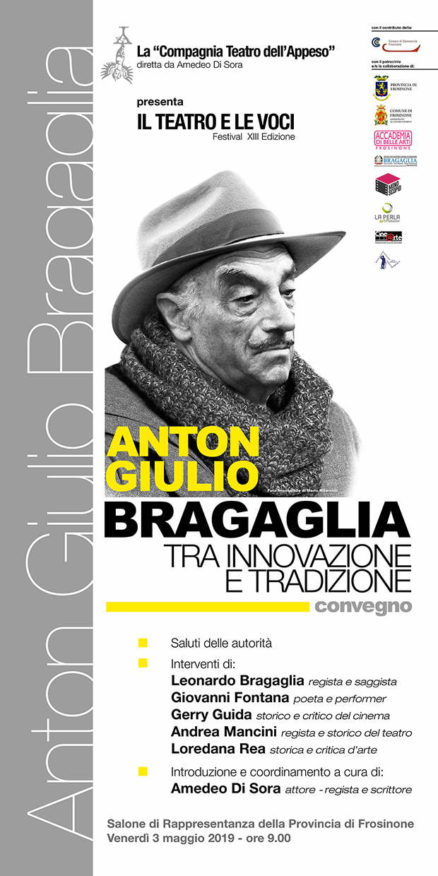 la Compagnia Teatro dell’Appeso, associazione culturale da trentanove anni operante in ambito artistico-culturale e didattico-pedagogico, sotto la direzione artistica di Amedeo di Sora, organizza la XIII Edizione del Festival “Il Teatro e le Voci” che renderà omaggio alla figura e all’opera di Anton Giulio Bragaglia, artista poliedrico e grande protagonista della cultura italiana del Novecento tra le due guerre mondiali, nato a Frosinone. Il programma si aprirà con un Convegno, curato e coordinato da Amedeo di Sora, dal titolo “A. G. Bragaglia tra innovazione e tradizione” che si terrà la mattina del 3 maggio dalle ore 9:00 alle ore 13:00 presso il Salone di Rappresentanza della Provincia di Frosinone, in Piazza Gramsci, cui interverranno il regista e scrittore Leonardo Bragaglia (figlio di Alberto, fratello di Anton Giulio), Giovanni Fontana (poeta e performer), Gerry Guida (storico e critico del cinema), Andrea Mancini (regista e storico del teatro), Loredana Rea (storica e critica d’arte).