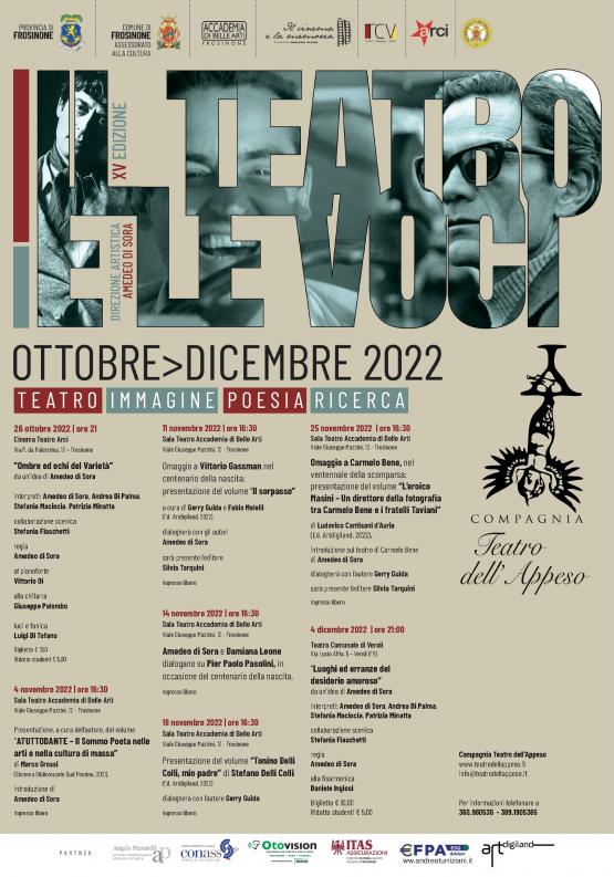 Lo spettacolo rappresenta il primo appuntamento del Festival “Il Teatro e le Voci”, diretto da Amedeo di Sora, giunto alla XV Edizione, manifestazione artistico-culturale nata nel 2004 che, fin dall’origine, si propone di costituire un momento non occasionale di riflessione storico-critica e di elaborazione artistica sul rapporto Teatro – Immagine – Poesia – Ricerca, con particolare riferimento alla dimensione vocale. Le edizioni precedenti sono state imperniate sul valore dell’opera di una eminente personalità artistica che abbia saputo attraversare e/o sollecitare molteplici percorsi. L’ultima edizione, del 2021, è stata incentrata sulla celebrazione del quarantennale dell’attività della Compagnia Teatro dell’Appeso. Quest’anno, il Festival ospiterà anche alcune giornate dedicate al cinema e collegate alla manifestazione “Il Cinema e la Memoria” (XI edizione)  diretta da Amedeo di Sora e Gerry Guida. Ci saranno omaggi a Vittorio Gassman e Pier Paolo Pasolini, di cui ricorre il centenario della nascita, e a Carmelo Bene nel ventennale della scomparsa, oltre ad altri incontri e a due spettacoli della Compagnia, che saranno presentati al pubblico in forme e cast rinnovati.
