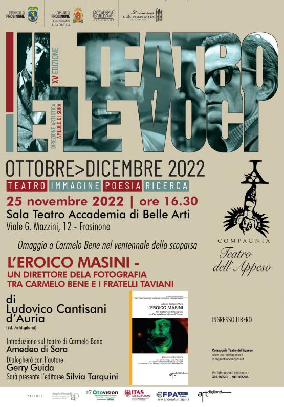 Il 25 novembre 2022, alle ore 16:30, presso la Sala Teatro dell'Accademia di Belle Arti di Frosinone, in Viale G. Mazzini 12, nell'ambito della XV Edizione del Festival "Il Teatro e le Voci" promosso e organizzato dalla Compagnia Teatro dell'Appeso, avrà luogo la presentazione del libro "L'eroico Masini - Un direttore della fotografia tra Carmelo Bene e i fratelli Taviani" di Ludovico Cantisani d'Auria (Ed. Artdigiland). Dopo un'introduzione del direttore artistico del Festival Amedeo di Sora sul teatro beniano, dialogherà con l'autore Gerry Guida.
